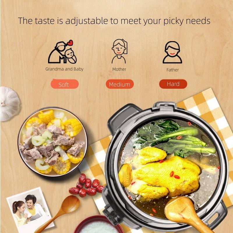 Feature highlights:This multipurpose electric pressure cooker features a 6L capacity, 1000W power, and a durable stainless steel outer pot with a non-stick aluminum inner pot. It includes safety features like high-temperature protection, an LED display, and a working pressure range of 0-70kpa. Accessories include a measuring cup, spoon, and water collector, making it ideal for household or commercial use.